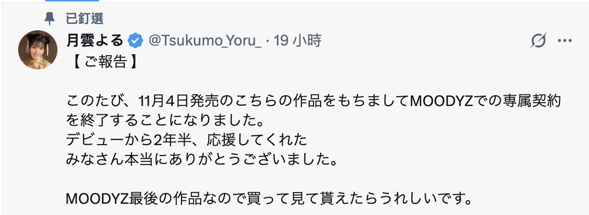 明明是支很正常的作品啊,怎么「月云よる(月云夜)」突然就告诉大家这是她在片商Moodyz 的最后一支作品?现在大家都流行到了最后关头才把发片异动说出来吗?