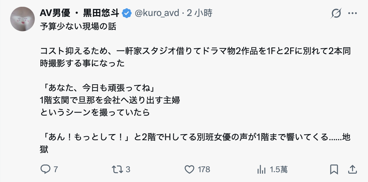 来看AV男优黒田悠斗(黑田悠斗)的发文,他说为了节省成本,片商会租借那种独栋透天厝的摄影棚同时开拍两支作品:这样做的目的是可以利用不同的场景开拍不同的作品,比方说可以在一楼玄关开拍人妻送老公上班的画面,而空置的二楼就可以让另一个剧组拍摄床戏,大家只要小心不要穿帮就好,一个工作天可以完成两支作品,超划算~