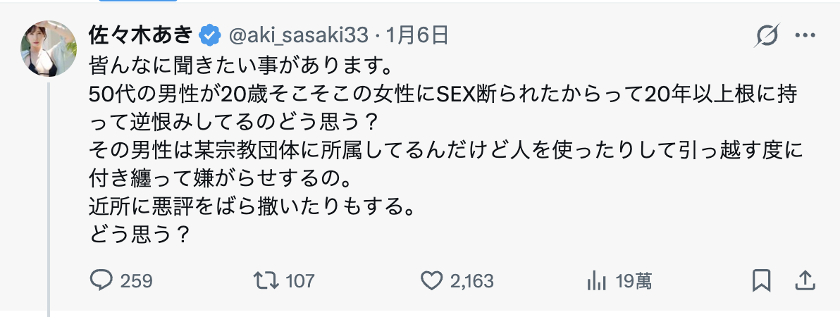 前天(1/6),这位不久前才复活的美丽熟女在社群(https://x.com/aki_sasaki33)公布了一段长久以来困扰自己的事,我直翻如下: